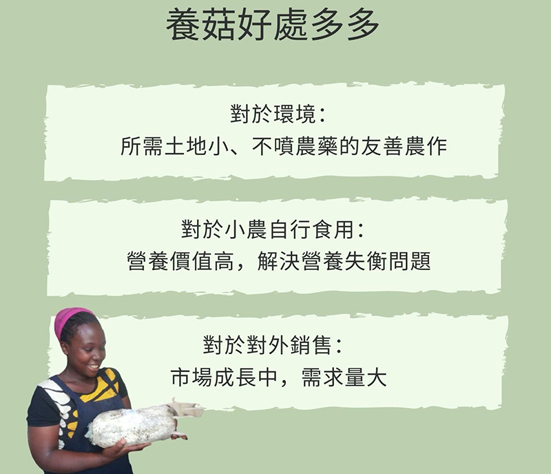 ▲此外,以課程中所包含的蘑菇為例,在烏干達偏鄉推廣養菇有幾大好處。
