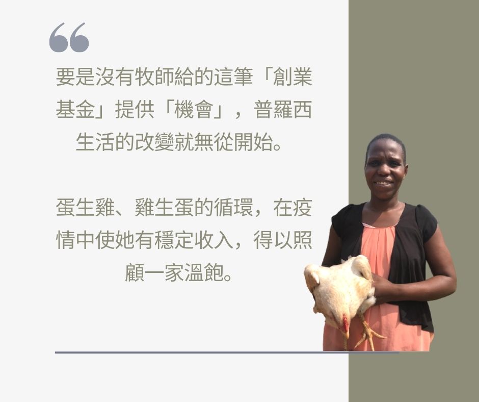 普羅西,過去身長在戰亂中的北烏干達,五歲前父母雙逝。因成長過程受到幫助而在成年後決定隻身前往南蘇丹幫助因內戰支離破碎的社群。疫情爆發後的鎖國使她無處可去,也沒有收入來源。她向牧師借錢購買小雞,並在小雞長大後賣出,扣除還給牧師的錢,她在一個月內賺得接近五千台幣的收入。這筆錢或許聽起來不多,卻足以在疫情時照顧她一家溫飽,還包括她與丈夫所收容的孩子們。
