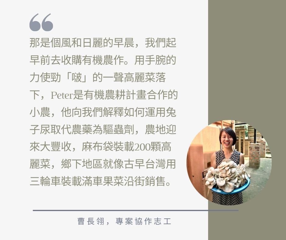 ▲由國合會派駐,來自台灣的曹長翎志工也參與了契作收成的過程我們因此設計了為期三個月的課程,扎實地幫助小農從學習理論開始、實作直到收成取得第一筆收入。