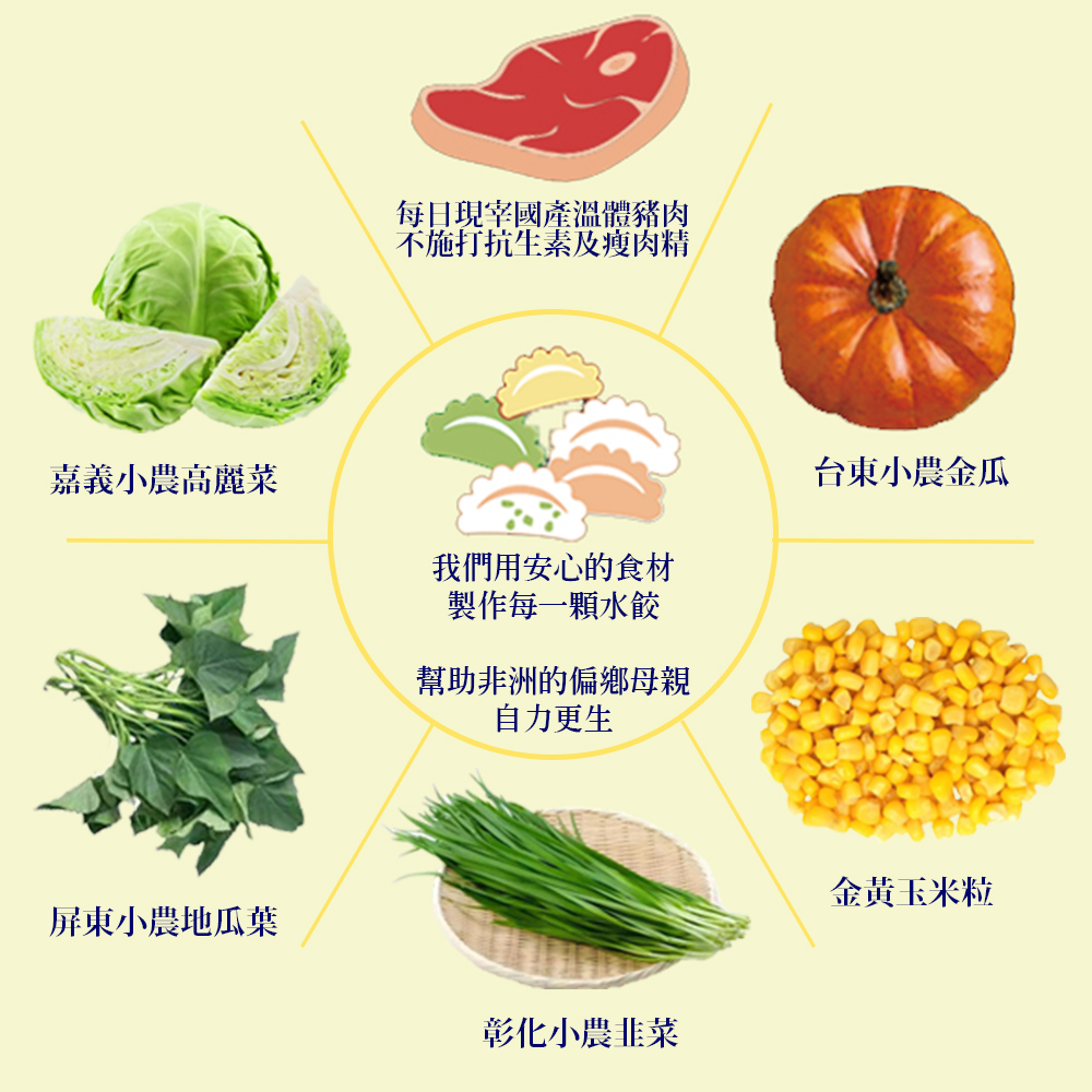 台灣在地小農水餃共有五種口味,多元的食材選擇,也飽含著我們的願景與目標:提升非洲偏鄉家庭的食物多樣性,消除飢餓與營養不良、邁向永續農業發展。