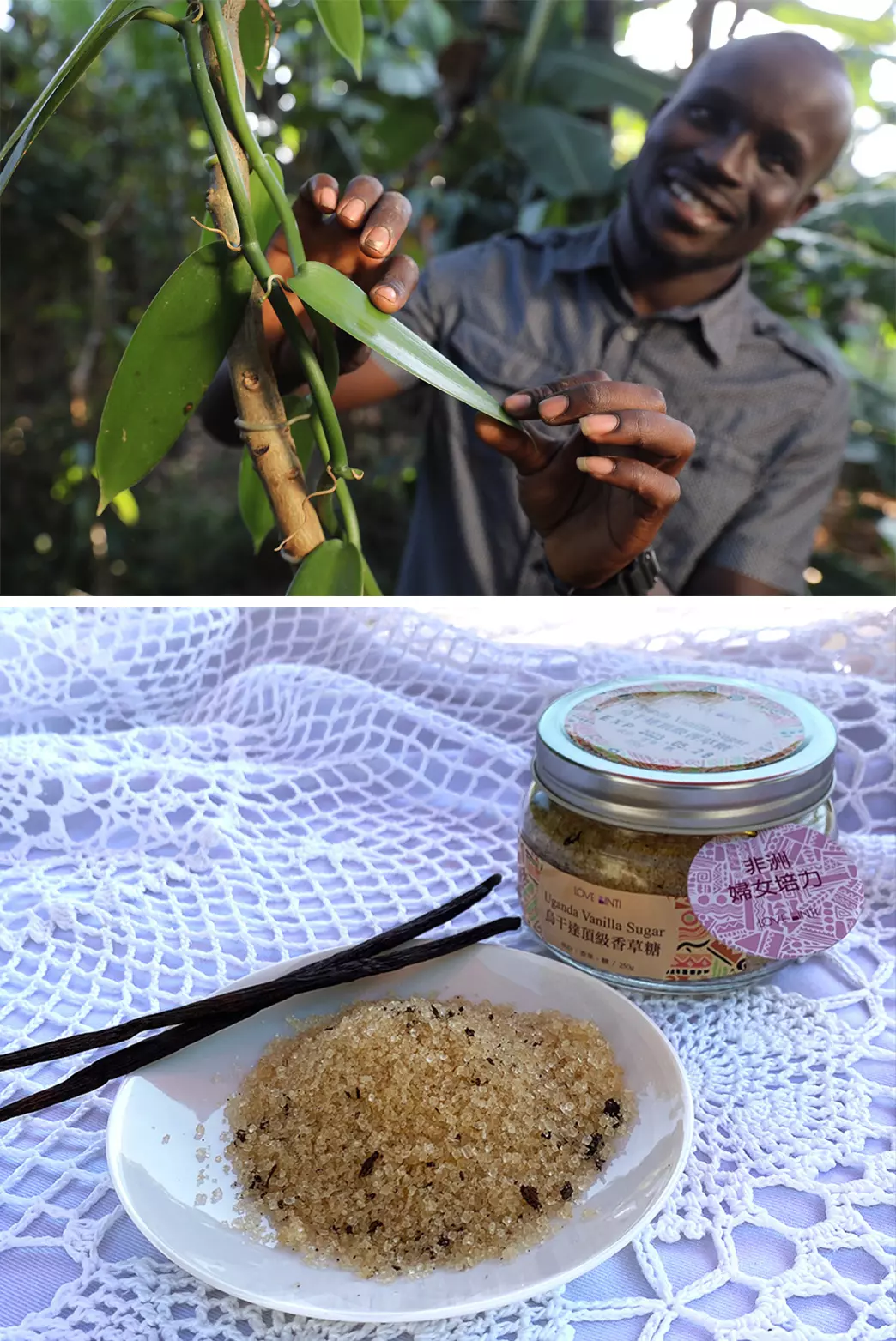 烏干達的氣候合適,產出高香草醛含量的迷人豆莢,足以媲美馬達加斯加。將烏干達的的香草莢打碎加入紅糖內,使紅糖充滿香草香味,作為烘焙使用去除蛋腥味、或是直接加入茶及咖啡。