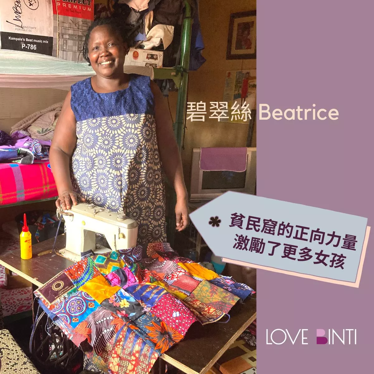 碧翠絲(Beatrice)是今年第一期的畢業生,她利用微型貸款計畫買了一台二手裁縫車,開始自己的事業了!她在家接案,縫製裙子、制服、包包等各式的製品。她巧妙地運用每一吋布料,就連碎布也能拼成地毯或地墊。碧翠絲對許多在她社區的年輕女孩與單親媽媽來說是個很好的榜樣,而她也鼓勵其他人一起來工作室協助,也參加愛女孩的裁縫訓練,創造不設限的未來!