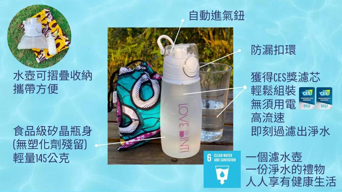 由愛女孩與膜淨材料共同推出的隨身淨水壺,攜帶方便、過濾即可飲用,幫助您隨時取得安全的水。