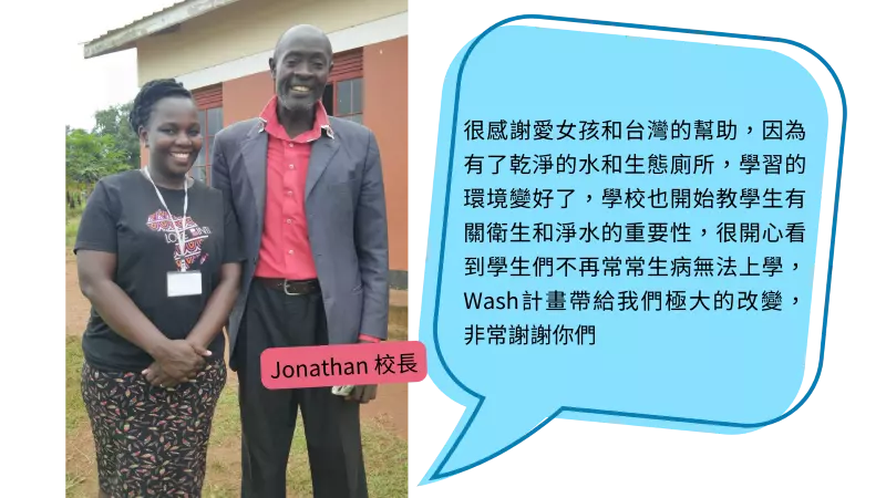 校長jonathan深刻體會到乾淨水帶來的改變,他對我們說 :「很感謝愛女孩和台灣的幫助,因為有了乾淨的水和生態廁所,學習的環境變好了,學校也開始教學生有關衛生和淨水的重要性,很開心看到學生們不再常常生病無法上學,Wash計畫帶給我們極大的改變,非常謝謝你們」