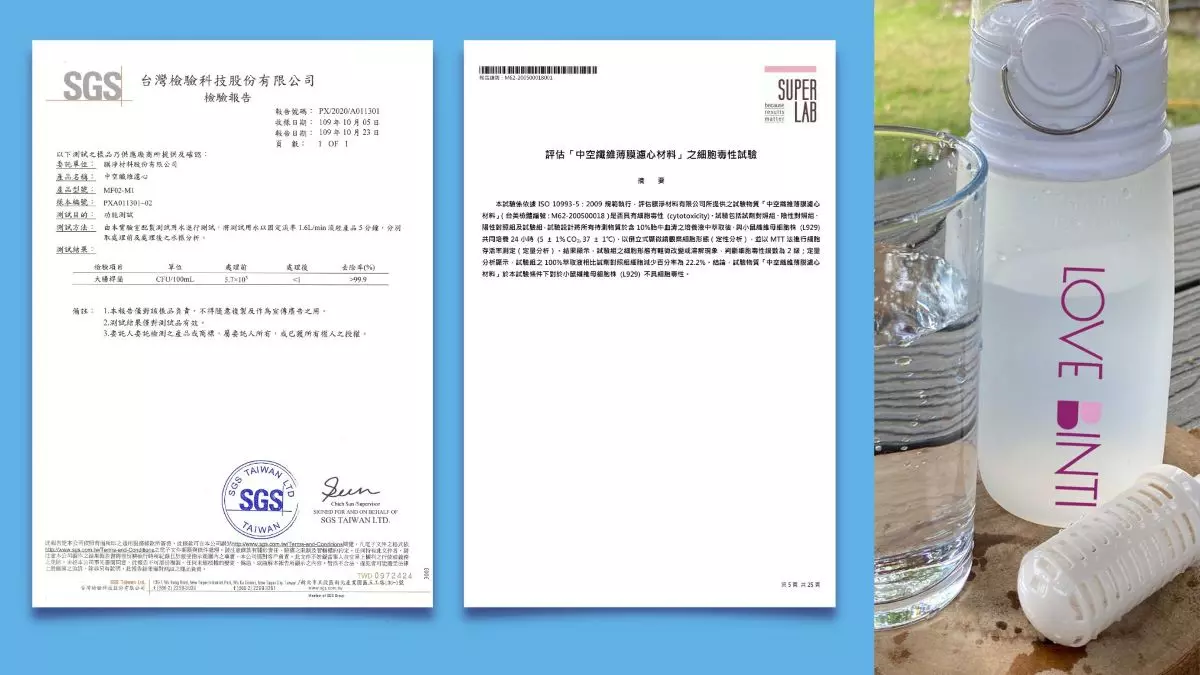 過濾出的水質通過SGS大腸桿菌除菌檢驗去除率高達99.9%;台美生物相容性安全檢驗,材料安全測試不具細胞毒性,材料放心也喝得安心。