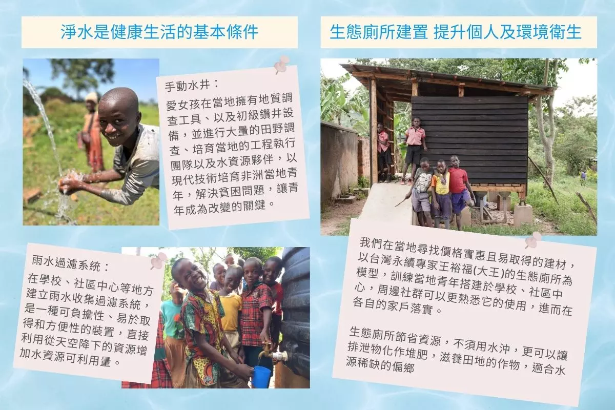 愛女孩從2015年開始,深耕在烏干達Mukono、Kayunga、Namayingo 20個偏鄉社區改善100萬人的基礎生活需要,以挖水井、建立雨水過濾系統、生態廁所改善用水品質,數百場的布衛生棉衛教工作坊,提升當地基礎建設,並落實教育,改善生活品質進而提升社區發展能量。