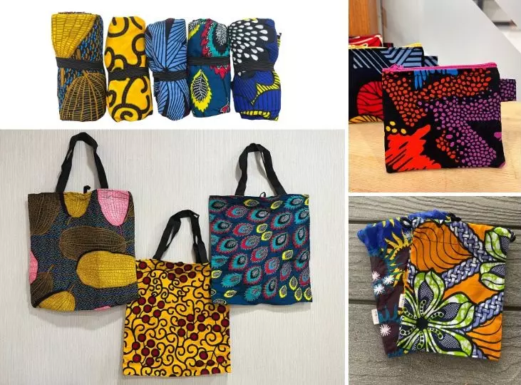 非洲媽媽參與裁縫訓練工坊,結訓後製作,手工縫製、獨特非洲花布,每款獨一無二(花布提袋尺寸:35x35cm,誤差值±2cm;零錢包尺寸:10x9cm,誤差值±0.3cm);束口袋為台灣縫紉老師製作(尺寸:約17x20cm;誤差值±0.5cm)※因款式眾多,採隨機出貨,還請見諒