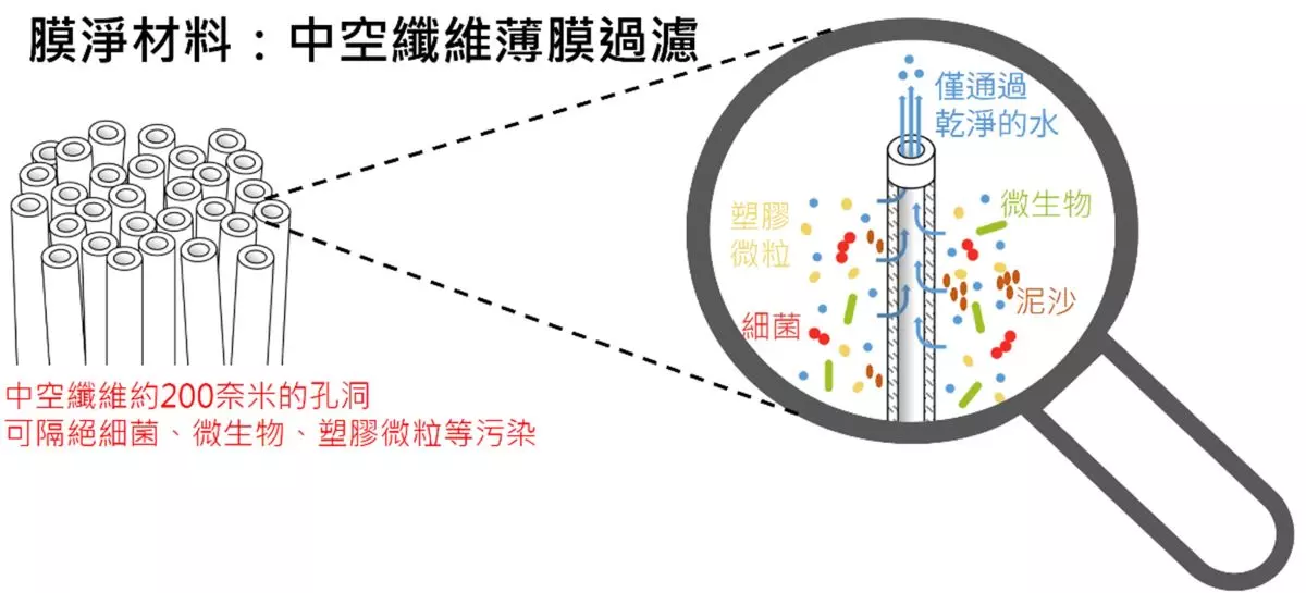 膜淨材料獨家開發除菌中空纖維薄膜,薄膜擁有千萬個奈米小孔,可以有效阻擋細菌、微生物及塑膠微粒等有害物資,同時還保有超高流速,無需電力就可以直接過濾,非常適合在戶外、緊急救難、水質較差的場所,過濾溪水、山泉水、雨水等水源後飲用,降低風險,大腸桿菌去除率達99.9%,瞬間讓髒水變得清澈乾淨,飲水的安全性提高許多。