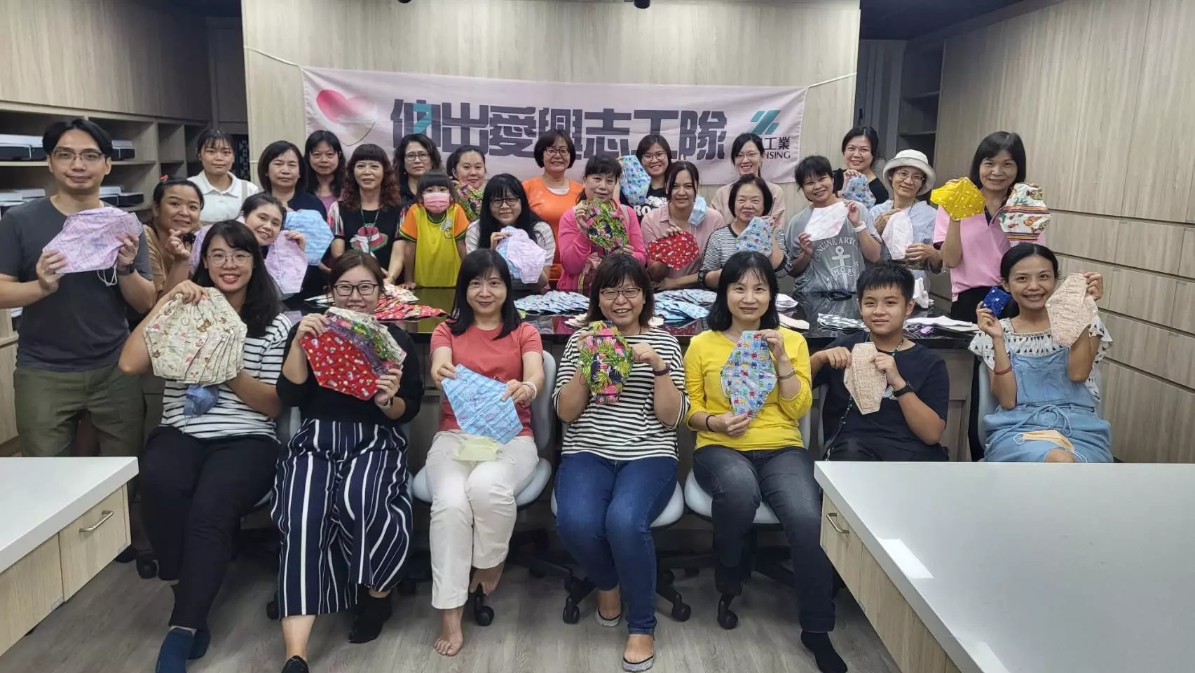 「伸出愛興志工隊」,以一條龍的方式生產,畫線、裁布、縫紉等,分工合作,在一天的時間內就完成了133份成品、24份半成品以及170份料包,大家真的超棒的❣️