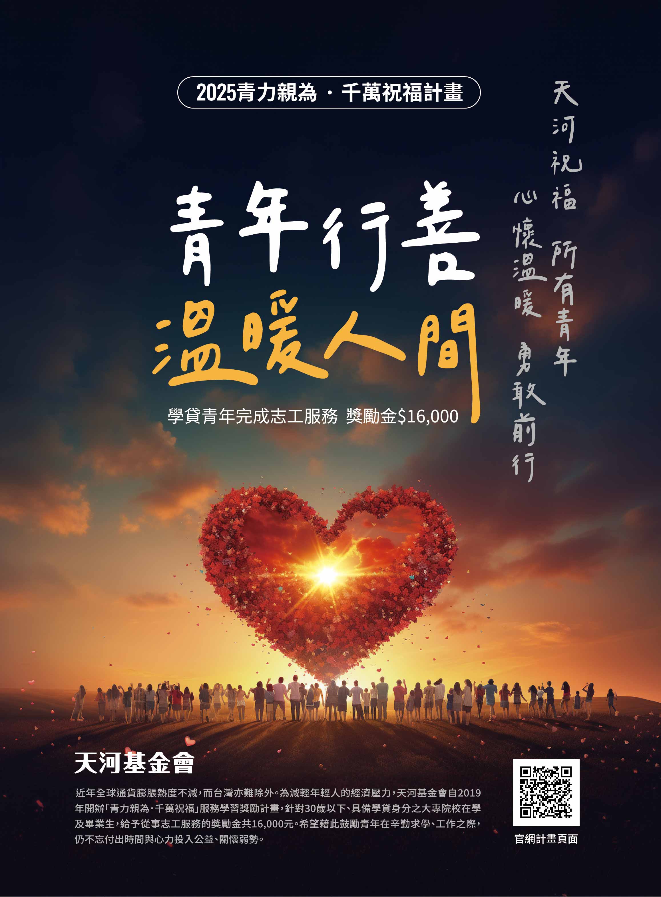 只要你投入公益行動,參與志工服務,天河教育基金會將提供每人 16,000 元的獎勵金,減輕你的學貸壓力,也陪你在助人的過程中,找到成就感與人生方向!